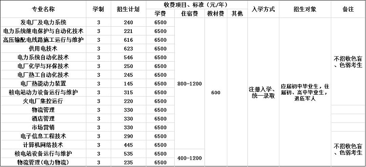 1.招生专业:发电厂及电力系统专业、发电厂及电力系统专业、电力系统继电保护与自动化技术专业、高压输配电线路施工运行与维护专业、供用电技术专业、电力系统自动化技术专业、电厂化学与环保技术专业、电厂热工自动化技术专业、电厂热能动力装置专业、核电站动力设备运行与维护专业、火电厂集控运行专业、物流管理专业、酒店管理专业、市场营销专业、电子信息工程技术专业、计算机网络技术专业、核电站设备运行与维护专业、物流管理(电力物流)专业