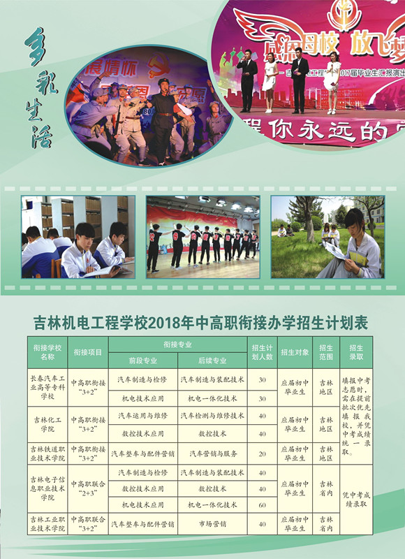 学校创新办学模式,既有“2.5+0.5”学制的中专就业教育,还有与长春汽车工业高等专科学校、吉林化工学院、吉林铁道职业技术学院、吉林电子信息职业技术学院、吉林工业职业技术学院等高职院校开展的“3+2、2+3”中高职衔接办学及联合办学模式。学习期满,我校颁发中职毕业证书,高职院校颁发大专毕业证,实现学生初中直升大专的大学梦。